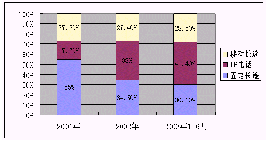 從圖上看,移動(dòng)長途占整個(gè)長途通話比重增長緩慢,IP長途所占比重上升較快,已由2001、2002年的17.7%、38%上升到41.4%,與此相反,傳統(tǒng)固定長途所占比重下降較快,由2001年占整個(gè)長途通話的55%,迅速下降到目前的30.1%。隨著移動(dòng)長途、IP長話的異質(zhì)競爭加劇,大量分流了傳統(tǒng)固定長途,2003年1-6月傳統(tǒng)固定長途中國內(nèi)長途、國際及港澳臺(tái)通話時(shí)長比上年同期分別下降0.6%、6.4%、13.9%。