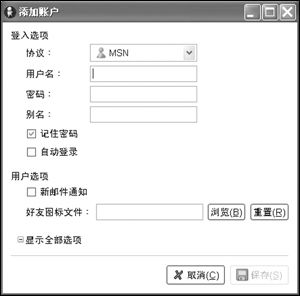選擇協(xié)議:在“協(xié)議”下拉列表框中選擇你要使用的即時(shí)通訊工具名稱,例如這里我們準(zhǔn)備添加一個(gè)MSN賬號(hào),那么就選擇“MSN”協(xié)議;如果是添加ICQ賬號(hào),那么應(yīng)該選擇“AIM/ICQ”協(xié)議。