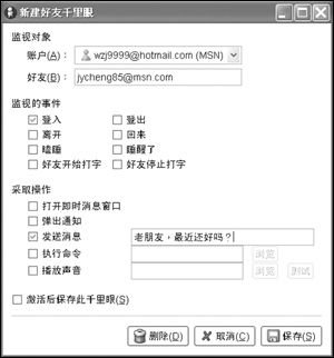 MSN可以在好友登錄時(shí)設(shè)置提示,但卻無法像QQ一樣自動(dòng)發(fā)出特定問候,這未免有些遺憾。在Gaim中,我們可以為那些暫時(shí)不在線的好友添加千里眼監(jiān)視功能(如圖3),這里可以監(jiān)視的事件包括登入、登出、離開、回來、瞌睡、睡醒了、好友開始打字、好友停止打字等等,而可以設(shè)置的提示方式是打開即時(shí)消息窗口、彈出通知、發(fā)送消息、執(zhí)行命令、播放聲音等等,非常豐富!