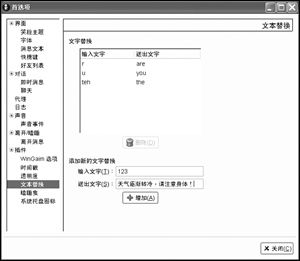 文本替換:根據(jù)用戶自定義的規(guī)則替換發(fā)出的消息,其實(shí)差不多類似于縮寫功能,你可以把一段話定義成一個(gè)字母,以后只要輸入這個(gè)字母,就會(huì)直接顯示這段話了。比如在缺省設(shè)置下,輸入“r”即可送出“are”,輸入“u”即可送出“you”(如圖7)。