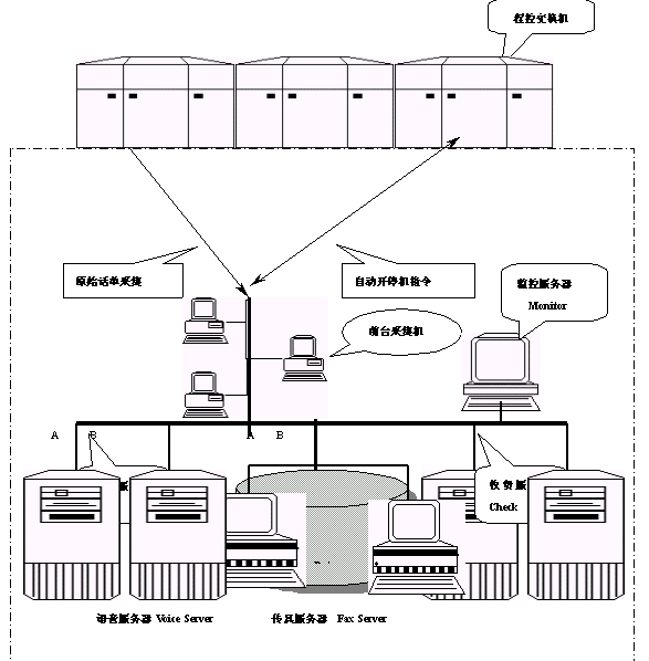 本系統(tǒng)可以分為:話單采集傳輸子系統(tǒng)、計(jì)費(fèi)帳務(wù)處理子系統(tǒng)、收費(fèi)服務(wù)子系統(tǒng)、語音查詢充值子系統(tǒng)、自動(dòng)開停機(jī)子系統(tǒng)和監(jiān)控服務(wù)子系統(tǒng)六個(gè)模塊。