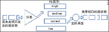 為了實(shí)現(xiàn)QoS,需要改變傳統(tǒng)IP網(wǎng)絡(luò)的FIFO隊(duì)列傳輸報(bào)文機(jī)制,轉(zhuǎn)而采用優(yōu)先級(jí)隊(duì)列(Priority Queueing, PQ)機(jī)制,見圖2。