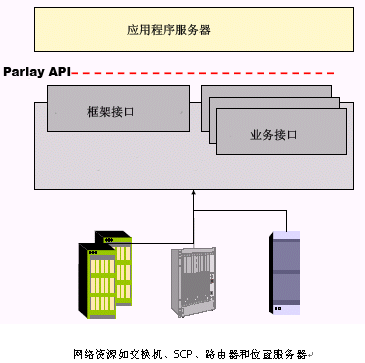 Parlay/OSA設(shè)想應(yīng)用程序運行在應(yīng)用服務(wù)器上,通過TCP/IP連到Parlay/OSA網(wǎng)關(guān)。