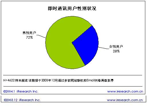 根據(jù)艾瑞市場(chǎng)咨詢(iResearch)的《2003年中國(guó)即時(shí)通訊研究報(bào)告》研究結(jié)果表明,在中國(guó)的即時(shí)通訊用戶中,72%的即時(shí)通訊用戶為男性,占據(jù)了大部分份額。女性用戶僅僅占28%。看來(lái)男性網(wǎng)民更喜歡在網(wǎng)上聊天。