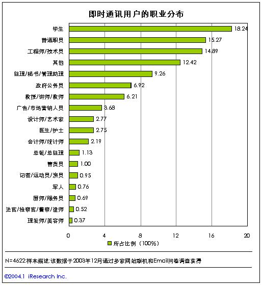 從即時(shí)通訊用戶的職業(yè)結(jié)構(gòu)來(lái)看,在中國(guó)的即時(shí)通訊用戶中,學(xué)生、普通公司職員、工程技術(shù)人員構(gòu)成了最主要的用戶群體,其中學(xué)生的比例最高,達(dá)到了18.24%。看開學(xué)生是中國(guó)即時(shí)通訊的生力軍。