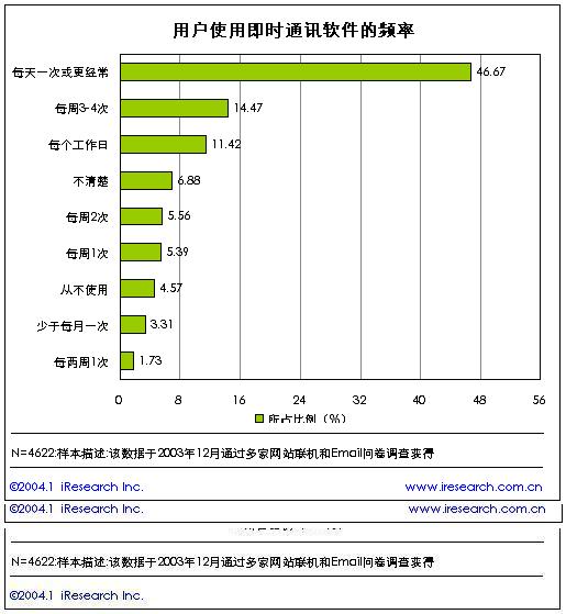 即時(shí)通訊所擁有的實(shí)時(shí)性、跨平臺(tái)性、成本低、效率高等諸多優(yōu)勢(shì),使之成為網(wǎng)民們最喜愛的網(wǎng)絡(luò)溝通方式之一。從用戶使用即時(shí)通訊軟件的頻率來(lái)看,是比較高的。根據(jù)我們的調(diào)研結(jié)果,58%的用戶至少每天使用一次即時(shí)通訊軟件,使用頻率在每周一次以下的用戶比例僅為15%。