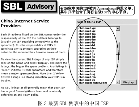 垃圾郵件損害的不只是中國(guó)的國(guó)際形象,中國(guó)反垃圾郵件聯(lián)盟的葉豪告訴記者,類似SBL(更一般的是RBL,即“實(shí)時(shí)黑名單”)這樣的服務(wù)是由國(guó)外的一些公司或第三方組織提供的,目前已經(jīng)成為國(guó)際上比較通行的防范垃圾郵件的措施。而在具備較高知名度的Spamhaus所維護(hù)的這份黑名單中,我國(guó)的ISP竟然多達(dá)80家(如圖3),幾乎所有的省級(jí)ISP都位列其中!爸袊(guó)很多大的ISP都在不同的‘黑名單’里,從這些國(guó)內(nèi)ISP發(fā)出的郵件,那些用‘黑名單’的客戶根本就收不到,F(xiàn)在‘黑名單’是比較好用的一種辦法,所以使用‘黑名單’服務(wù)的企業(yè)也越來越多,國(guó)際上針對(duì)中國(guó)的信息壁壘就越來越厲害,再不采取措施,中國(guó)就等著被全世界‘封掉’吧!”