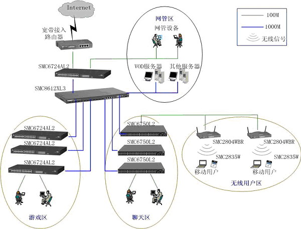 本方案采用"千兆光纖干線,百兆交換到桌面"的設(shè)計思路,各骨干線路均為1000M。骨干網(wǎng)通過高速線路接入INTERNET,網(wǎng)吧內(nèi)實現(xiàn)主干千兆交換、百兆到點,整個網(wǎng)吧內(nèi)實現(xiàn)無阻塞通信。根據(jù)顧客的不同消費需求,將網(wǎng)吧分為了網(wǎng)絡(luò)游戲區(qū)、聊天區(qū)、貴賓區(qū)等,根據(jù)不同區(qū)域的特點,細化了不同網(wǎng)絡(luò)的解決方案。方案中采用的核心設(shè)備和二層設(shè)備都支持802.1Q標(biāo)準(zhǔn)VLAN和IGMP組播協(xié)議,為VOD、多媒體娛樂等豐富應(yīng)用的開展打下了堅實的基礎(chǔ) 。通過劃分VLAN,MAC地址綁定來劃分了不同類型用戶,很好地滿足網(wǎng)吧的各項業(yè)務(wù)應(yīng)用需求。此外,SMC的豐富無線網(wǎng)絡(luò)產(chǎn)品可以很靈活的滿足網(wǎng)吧的組網(wǎng)需求,投資少、施工快。在提供高性能的同時,還保證很好的安全性,既支持基于802.11b標(biāo)準(zhǔn)的安全機制,又支持動態(tài)安全鏈路,以及基于802.1x的增強性安全或認證功能。