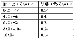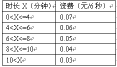 例3,國內(nèi)長途話費在時長不超過4分鐘的情況下,按0.07元/6秒收;超過4分鐘但不超過6分鐘,統(tǒng)一按0.06元/6秒收;超過6分鐘但不超過8分鐘,統(tǒng)一按0.05元/6秒收。怀^8分鐘但不超過10分鐘,統(tǒng)一按0.04元/6秒收取;超過10分鐘,統(tǒng)一按0.03元/6秒收取。