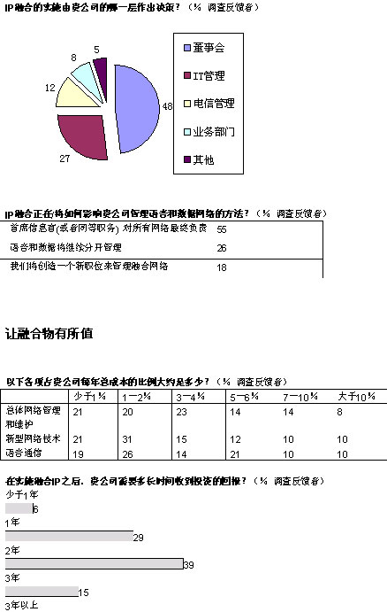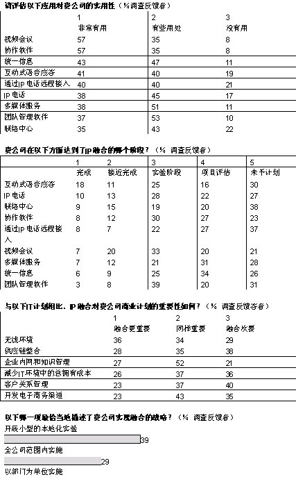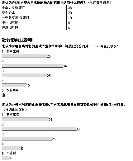 融合網絡已經成為現(xiàn)實。在經濟學家信息部展開的全球調查中,103位高級經理中超過半數(shù)的人投票表示,他們的企業(yè)已經開始實施IP網絡融合,還有26%表示他們將計劃部署。