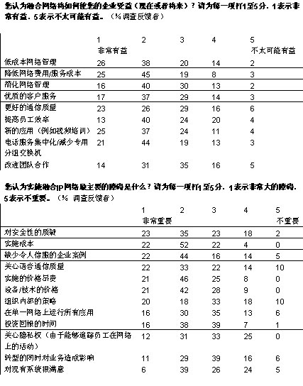不久以前,“融合”這個詞給人的感覺是過分追捧技術和超前于時代的概念。此后不久,傳輸數(shù)據(jù)、語音和視頻的網絡融合逐漸成為現(xiàn)實。根據(jù)對103位高級經理的調查結果表明,三分之二的企業(yè)正計劃在今后五年內將其覆蓋整個企業(yè)的應用轉型為統(tǒng)一的IP網絡。四分之一的調查反饋者認為這對實現(xiàn)其企業(yè)戰(zhàn)略“尤為重要”。