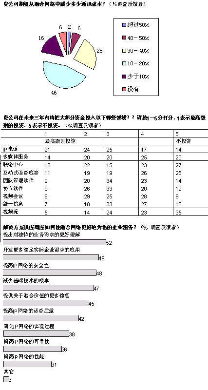 盡管如此,雖然IP融合的真正長期效益可能有利于提高員工效率,但是投資必須得到公司首席財務官的認可。在總體網絡成本中預計可以節(jié)約多少?大多數(shù)公司希望削減10%-20%的費用,也有相當一部分公司期望減少30%-40%的費用。上述報告中提到的實例中表明,這樣的節(jié)約是可以實現(xiàn)的。