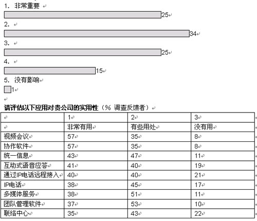 我們調查的企業(yè)中,有超過三分之二將在未來五年內實現(xiàn)大多數(shù)或者所有部門向融合網絡的轉型。大部分企業(yè)采取按部就班的形式在某些特殊部門和業(yè)務開始部署。在融合應用中,IP語音電話將在未來三年內吸引大量投資;管理人士期望通過大幅削減公司內部的通話費用獲得早期的回報。在更廣泛的層面上,大多數(shù)管理者預計,融合網絡對其企業(yè)的商業(yè)影響將會“非常重要”或者“重要”。