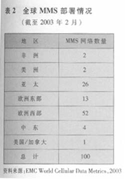 據(jù)EMC統(tǒng)計,到2003年2月,全球在47國家有100家運(yùn)營商部署了MMS網(wǎng)絡(luò)(見表2)。