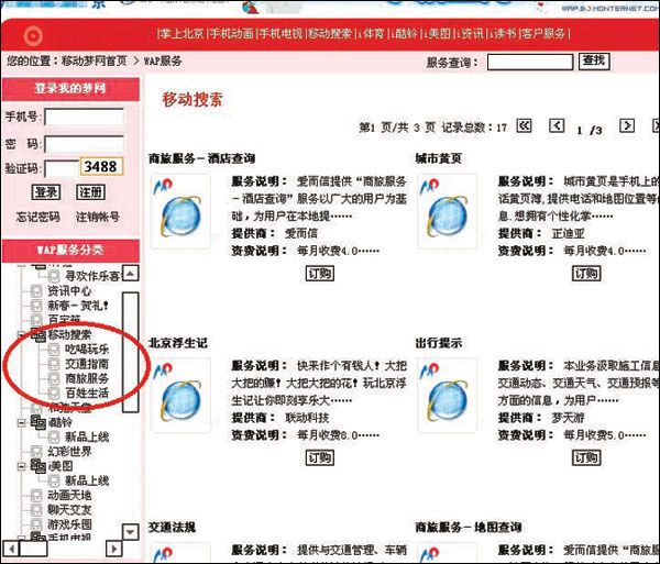 圖1 移動運營商網(wǎng)站上列出的移動搜索業(yè)務分類