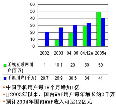 我們可以拿手機應用發(fā)展迅速的鄰國日本做比照,其WAP站點數(shù)量從100個增長到8萬多個,足足用了3年時間。劉斌認為,中國的WAP市場正在經(jīng)歷一個上升期,“現(xiàn)在國內(nèi)大大小小的WAP站點一共有2000來個,相對于國內(nèi)龐大的手機用戶總數(shù)來說,只能算是發(fā)展的初期”,劉斌的言外之意是,在今后的兩年里,中文WAP資源仍值得期待。