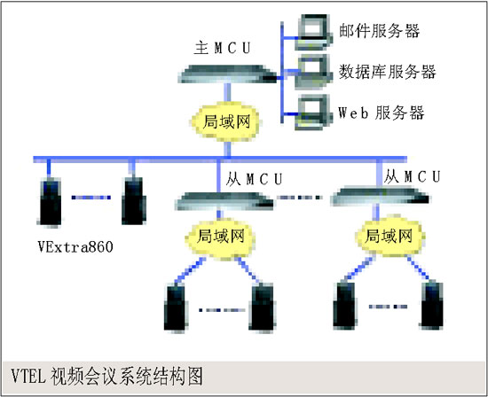 。。網(wǎng)絡(luò)拓?fù)鋱D如右下圖所示,在中心會場配置的VTEL的Meta 5000 MCU,不僅可以直接接入兩路本地主會場的視頻、音頻,還可以接入分會場的獨立會議電視終端。同時,還能接入要級聯(lián)的Meta