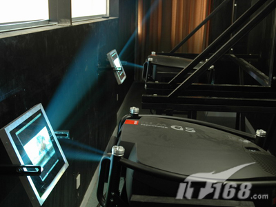 為了達到足夠大的尺寸,主屏幕采用SEAPRINE圖像控制器組成的1*2拼接,也就是采用了兩臺BARCO G5投影機來確保畫面的一流效果。不過由于投影距離的限制,這個方案里采用了二次反射系統(tǒng)。這也是這套方案的一個要點和關(guān)鍵。因為很多工程師利用一些概率來估算一次或多次折射可以縮短的投影距離,但欠缺科學(xué)和嚴(yán)謹?shù)膽B(tài)度,因為這個數(shù)據(jù)與屏幕安裝高度、投影方式(離軸或偏軸)、投影機體積、反射鏡面積等息息相關(guān)。