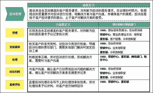 - 流程方面。投訴處理的后臺分屬不同的部門,流程不統(tǒng)一,管理和考核指標(biāo)也不統(tǒng)一; 投訴等級的標(biāo)準(zhǔn)不明確,各渠道不統(tǒng)一; 缺乏投訴升級流程,缺乏對各流程、各處理環(huán)節(jié)的時限定義。
