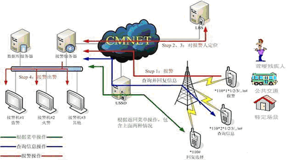 《移動(dòng)定位快信報(bào)警系統(tǒng)》是公眾的報(bào)警短消息是通過手機(jī)撥打“*110#”,經(jīng)過USSD移動(dòng)快信平臺(tái)和移動(dòng)位置信息服務(wù)(LBS)平臺(tái),報(bào)警信息數(shù)據(jù)和報(bào)警位置的經(jīng)緯度數(shù)據(jù)信息傳送到110指揮中心系統(tǒng)中,110值班干警通過網(wǎng)絡(luò)終端,根據(jù)報(bào)警內(nèi)容和報(bào)警人位置信息(電子地圖顯示)等數(shù)據(jù)進(jìn)行處警,特別情況可以直接撥打電話或通過短信(SMS)交互平臺(tái),進(jìn)一步與報(bào)警當(dāng)事人進(jìn)行短信交互。