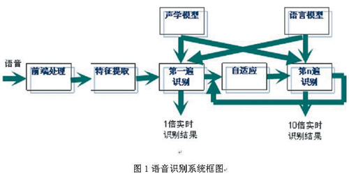 圖1所示為當前大多數(shù)語音識別系統(tǒng)采用的框架和流程。原始語音經前端處理后,從中提取出若干維的特征向量用于識別。識別時,聲學模型和語言模型共同作用,得到使某一概率最大的字串作為識別結果。
