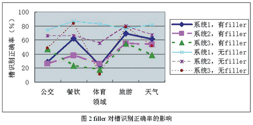 對于電話連續(xù)語音識別來說,由于錄制環(huán)境是辦公室真實環(huán)境,因此噪音并不是影響性能的主要因素。電話連續(xù)語音識別分為5個子領域,每個子領域各有一套語法。評測句子由語法生成的有效成分在前后加上任意長的填充詞(filler)構成,如語法生成的句子為“從天安門到中關村怎么坐公交車”,而實際錄制的句子是“你好,請問從天安門到中關村怎么坐公交車,可以查到嗎?”,其中的“你好,請問”和“可以查到嗎”就是filler。由分析可以發(fā)現(xiàn),不同領域內的槽識別正確率相差很大。這主要有兩個原因,一是不同領域的語法復雜度不同,二是不同領域內有filler的句子所占比例不同。為了進一步衡量filler對識別的影響,選取三個識別系統(tǒng),將有filler的句子和沒有filler的句子分別計算識別率,統(tǒng)計結果如圖2所示。從圖中可以看出,filler對識別的影響是相當大的,無filler的句子比有filler的句子識別正確率可以高幾十個百分點。