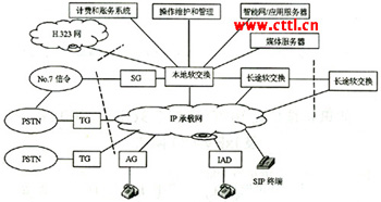 Access Media Gateway)、中繼媒體網(wǎng)關(guān)(Trunk Media Gateway)、綜合接入設(shè)備(IAD)等。圖1所示為軟交換系統(tǒng)測試邏輯組網(wǎng)圖。