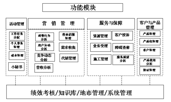 本系統(tǒng)主要有客戶與產(chǎn)品管理、營銷管理、服務與保障、活動管理、績效考核五大主要功能,如下圖所示。