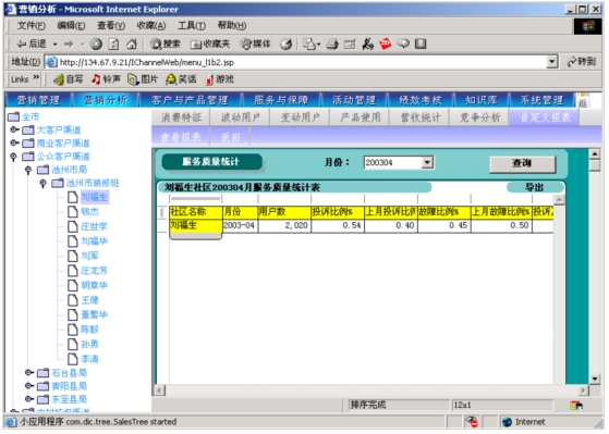 分析電信服務水平。如分析社區(qū)用戶投訴和故障發(fā)生情況,以及和上月相比情況。