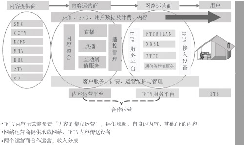 IPTV內(nèi)容集成運(yùn)營商,電信運(yùn)營商提供寬帶網(wǎng)絡(luò)及IPTV系統(tǒng),雙方合作提供業(yè)務(wù)的業(yè)務(wù)模式。這一模式一方面可以發(fā)揮廣電在內(nèi)容監(jiān)管、內(nèi)容運(yùn)營方面的優(yōu)勢,另一方面可以延續(xù)電信在互聯(lián)網(wǎng)運(yùn)營和維護(hù)上的優(yōu)勢。雙方之間的合作是資源與資源的對接,優(yōu)勢與優(yōu)勢的合作,各用所長,共同推進(jìn),利益共享。
