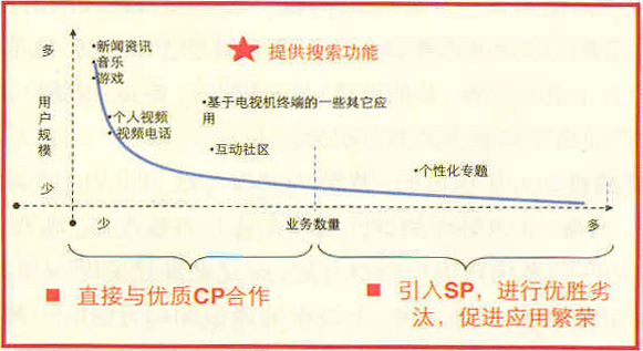 增值業(yè)務(wù)內(nèi)容定位可參考長尾理論模型。長尾理論的頭部通常是大眾市場,要求產(chǎn)品滿足用戶符號化的需求,主流業(yè)務(wù)將具備更廣的流行效應(yīng),如新聞、游戲和音樂,頭部的業(yè)務(wù)往往能夠滿足大規(guī)模用戶需求,提供優(yōu)質(zhì)業(yè)務(wù)體驗;尾部通常是細(xì)分市場和互動市場,要求業(yè)務(wù)滿足生產(chǎn)與消費一體化的需求,體現(xiàn)交互性,為用戶帶來整合的、一對一的體驗,以促進(jìn)IPTV應(yīng)用繁榮。