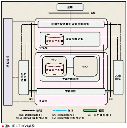 ITU-T下一代網(wǎng)絡(luò)的主要架構(gòu)如圖4所示,NACF是NGN傳輸層的功能實(shí)體,正對(duì)應(yīng)于TISPAN NGN架構(gòu)中的NASS。