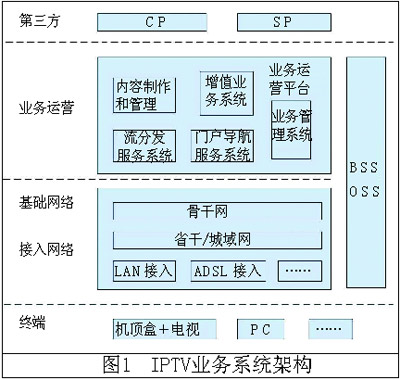 IPTV業(yè)務系統(tǒng)架構(gòu)可分為四層: 第三方業(yè)務提供者如CP和SP、業(yè)務運營層、網(wǎng)絡承載層和用戶終端層(如圖1)。
