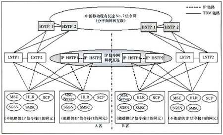 該種方案情況下,省內(nèi)支持IP信令的網(wǎng)元直接與IP LSTP相連(兩級(jí)組網(wǎng)情況下還需要通過(guò)TDM方式與現(xiàn)有HSTP相連),不支持IP信令的網(wǎng)元仍保持原有連接方式與現(xiàn)有LSTP相連(兩級(jí)組網(wǎng)情況下還要與HSTP)。省際信令消息仍由現(xiàn)有長(zhǎng)途No.7信令網(wǎng)疏通,省內(nèi)信令由LSTP疏通。