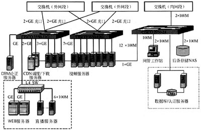 核心包括以下子系統(tǒng):WEB服務子系統(tǒng)、認證服務器、CDN調度/下載服務器、流媒體播出服務子系統(tǒng)、DRM認證服務子系統(tǒng)、數(shù)據(jù)庫服務子系統(tǒng)、后備存儲NAS系統(tǒng)、內(nèi)部管理服務子系統(tǒng)等。