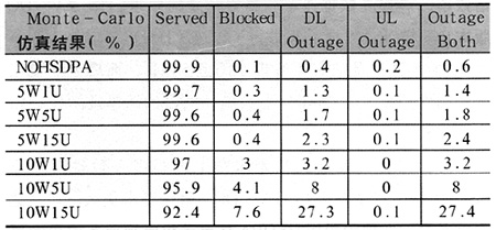 通過表3可以看出,隨著HSDPA功率分配的增加,網(wǎng)絡(luò)阻塞率和下行鏈路功率過載隨之增加,特別是功率增加到10W時,增加幅度尤為明顯;在一定的HSDPA功率分配前提下,隨著網(wǎng)內(nèi)HSDPA用戶數(shù)的增加,網(wǎng)絡(luò)阻塞率和下行鏈路功率過載隨之增加,特別是用戶數(shù)增加到15人時,增加幅度尤為明顯。可見HSDPA網(wǎng)絡(luò)性能在一定程度上受限于HSDPA功率分配和網(wǎng)內(nèi)HSDPA用戶數(shù)。