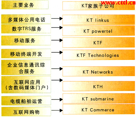 目前,KT集團(tuán)是全業(yè)務(wù)運(yùn)營(yíng)商,同時(shí)也是韓國(guó)最大的固網(wǎng)運(yùn)營(yíng)商,它在FMC領(lǐng)域最大動(dòng)作就是BcN寬帶融合網(wǎng)絡(luò),這是韓國(guó)政府為確保韓國(guó)在IT和電信技術(shù)市場(chǎng)持續(xù)領(lǐng)先地位而實(shí)行的IT839計(jì)劃的核心環(huán)節(jié)之一。BcN目的是要將有線與無(wú)線系統(tǒng)、通信和廣播系統(tǒng)融合在一起,為企業(yè)用戶和個(gè)人用戶提供一個(gè)共同的渠道收發(fā)語(yǔ)音、文本、圖像和視頻文件。為此,KT集團(tuán)順著新的價(jià)值鏈,對(duì)集團(tuán)內(nèi)部分機(jī)構(gòu)的功能進(jìn)行了調(diào)整,其主要組織架構(gòu)如圖2所示: