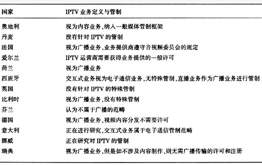 管制環(huán)境對(duì)IPTV的影響是根本性的。這種根本性主要體現(xiàn)在IPTV的準(zhǔn)入和業(yè)務(wù)劃分上,前者決定電信公司是否能夠經(jīng)營(yíng)IPTV,后者則決定IPTV應(yīng)如何管理。