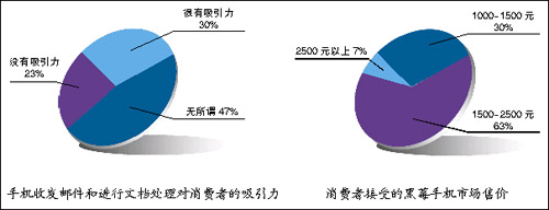 而根據(jù)調查結果,國內消費者對于黑莓手機市場售價的普遍接受范圍在2500元以下。有63%的消費者認為黑莓手機應該在1500-2500元,30%的消費者認為可以在1000元到1500元之間,只有7%的人認為黑莓手機售價應當超過2500元。