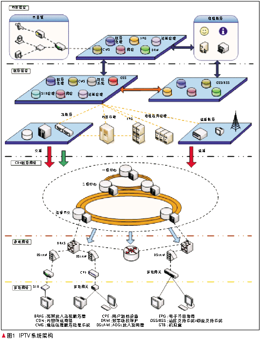 圖1所示為IPTV系統(tǒng)架構(gòu)。IPTV通用系統(tǒng)的邏輯結(jié)構(gòu)由內(nèi)容運(yùn)營平臺(tái)、業(yè)務(wù)運(yùn)營平臺(tái)、內(nèi)容傳送(CDN)業(yè)務(wù)網(wǎng)絡(luò)、承載網(wǎng)絡(luò)、家庭網(wǎng)絡(luò)5部分所構(gòu)成。
