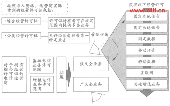 全業(yè)務(wù)可從電信管制、業(yè)務(wù)屬性及市場三個角度進(jìn)行定義。全業(yè)務(wù)運(yùn)營則可以從兩個角度來看待,一是從管制視角帶來的狹義全業(yè)務(wù);一是從多業(yè)務(wù)領(lǐng)域與電信結(jié)合的廣義全業(yè)務(wù)。具體表述可參照圖1。