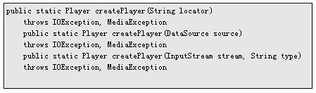 每個MMAPI程序都需要創(chuàng)建一個Player對象,前面我們已經介紹過,MMAPI使用Manager的CreatePlayer函數(shù)來創(chuàng)建Player對象,該函數(shù)有三個版本,其格式如下:
