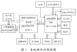 系統(tǒng)硬件主要由TI公司的TMS320DM643和三星公司的S3C2410組成。其中TMS320DM643完成音頻壓縮編解碼G.711/G.729/G.723.1和視頻壓縮編解碼H.264;S3C2410完成SIP協(xié)議和嵌入式OS及各種接口如RS232、復(fù)合視頻輸入/輸出、數(shù)字CCD攝像頭、LCD、RJ45、以太網(wǎng)、鍵盤(pán)等。音頻信號(hào)的輸入/輸出通過(guò)TI公司的TLV320AIC23送入TMS320DM643進(jìn)行壓縮編碼。