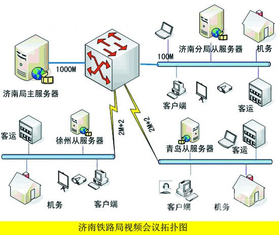 由于路局改革后組織結(jié)構(gòu)的特點(diǎn),決定了跨地域會(huì)議較多,如濟(jì)南和徐州、青島之間召開(kāi)的部門級(jí)別的會(huì)議比較頻繁,加上三地之間的帶寬制約,本方案采用了主從服務(wù)器的系統(tǒng)架構(gòu),1主3從,主服務(wù)器設(shè)置在路局網(wǎng)絡(luò)中心,原來(lái)濟(jì)南分局位置設(shè)置1臺(tái)從服務(wù)器,負(fù)責(zé)濟(jì)南地區(qū)的內(nèi)部會(huì)議,以及與其他2地的遠(yuǎn)程會(huì)議,同樣徐州、青島也各設(shè)置1臺(tái)從服務(wù)器。