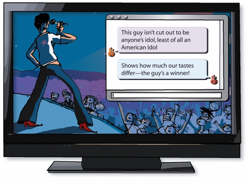 圖1:用戶(hù)可以一邊看“美國(guó)偶像”,一邊通過(guò)電視機(jī)向朋友發(fā)送短信,同時(shí)還研究最新競(jìng)爭(zhēng)對(duì)手的背景。