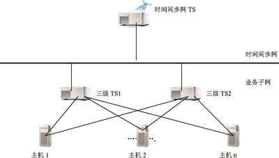 四川電信時間同步網(wǎng)對數(shù)據(jù)網(wǎng)元的授時,統(tǒng)一采用設(shè)置三級時間服務(wù)器方式。該方式須在數(shù)據(jù)網(wǎng)元內(nèi)部選定一臺或兩臺機器作為三級TS,三級TS同步到時間同步網(wǎng)的時間服務(wù)器,系統(tǒng)內(nèi)的其他主機與三級TS保持同步,如圖2所示。