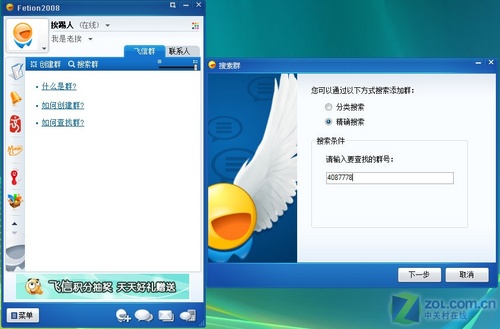 在圖4中,切換到“飛信群”選項(xiàng),單擊“搜索群”按鈕,在彈出的“搜索群”對(duì)話框中點(diǎn)選“精確搜索”,最后輸入“群號(hào)碼”并單擊“下一步”按鈕(如圖10)。