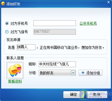 第一次登錄使用飛信的朋友可以通過(guò)兩個(gè)方式獲取好友,一個(gè)是將自己的號(hào)告知好友,讓他們將你加為好友,另一個(gè)是自己查找并添加其他好友(如圖2)。
