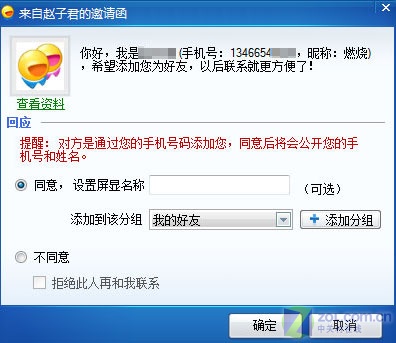 在圖3中,用戶在確認(rèn)好友發(fā)來(lái)的信息時(shí),為避免好友過(guò)多而忘記對(duì)方的身份,可以直接在上圖中增加類似QQ和MSN的“備注信息”,也即“屏顯名稱”。