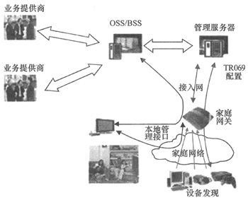 Forum的參考模型,加入了服務(wù)提供商,形成了服務(wù)提供商、BOSS、ACS、家庭網(wǎng)關(guān)、終端的整體管理架構(gòu)(如圖3所示),并著重研究RMS/ACS與HG之間接口、HG與ED之間接口[6]。